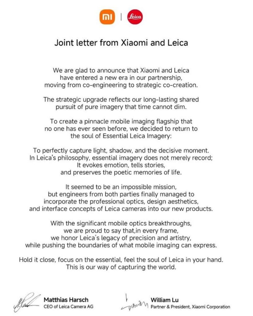 The joint letter hints at a next-generation evolution in the Xiaomi-Leica partnership. We are looking at the possibility of the Leica Edition Xiaomi 17 Ultra. Rather than just being an R&D companionship, the letter hints at an evolution into a strategic co-creation. The letter was signed by Matthias Harsh, CEO of Leica Camera AG, and William Lu, Partner & President of Xiaomi Corporation.