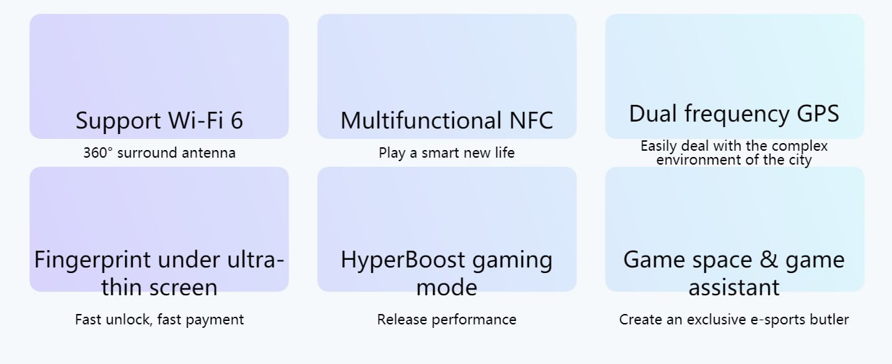 - Miscellaneous: Gaming-grade VC liquid-cooling system, Geomagnetic sensor, Light Sensor, Proximity Sensor, Gyroscope, Acceleration Sensor